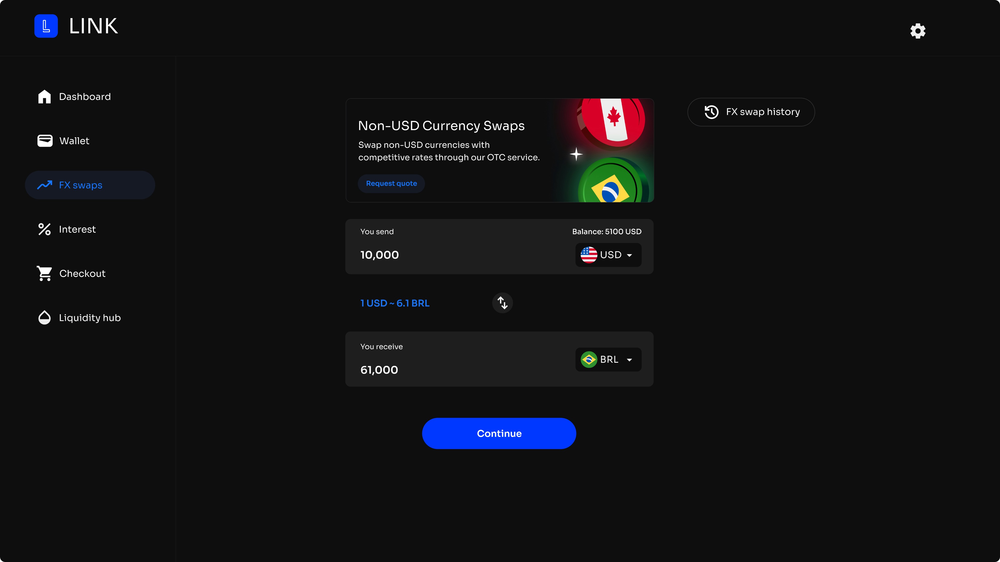 A stablecoin powered dashboard for collection & payouts in 15+ currencies.